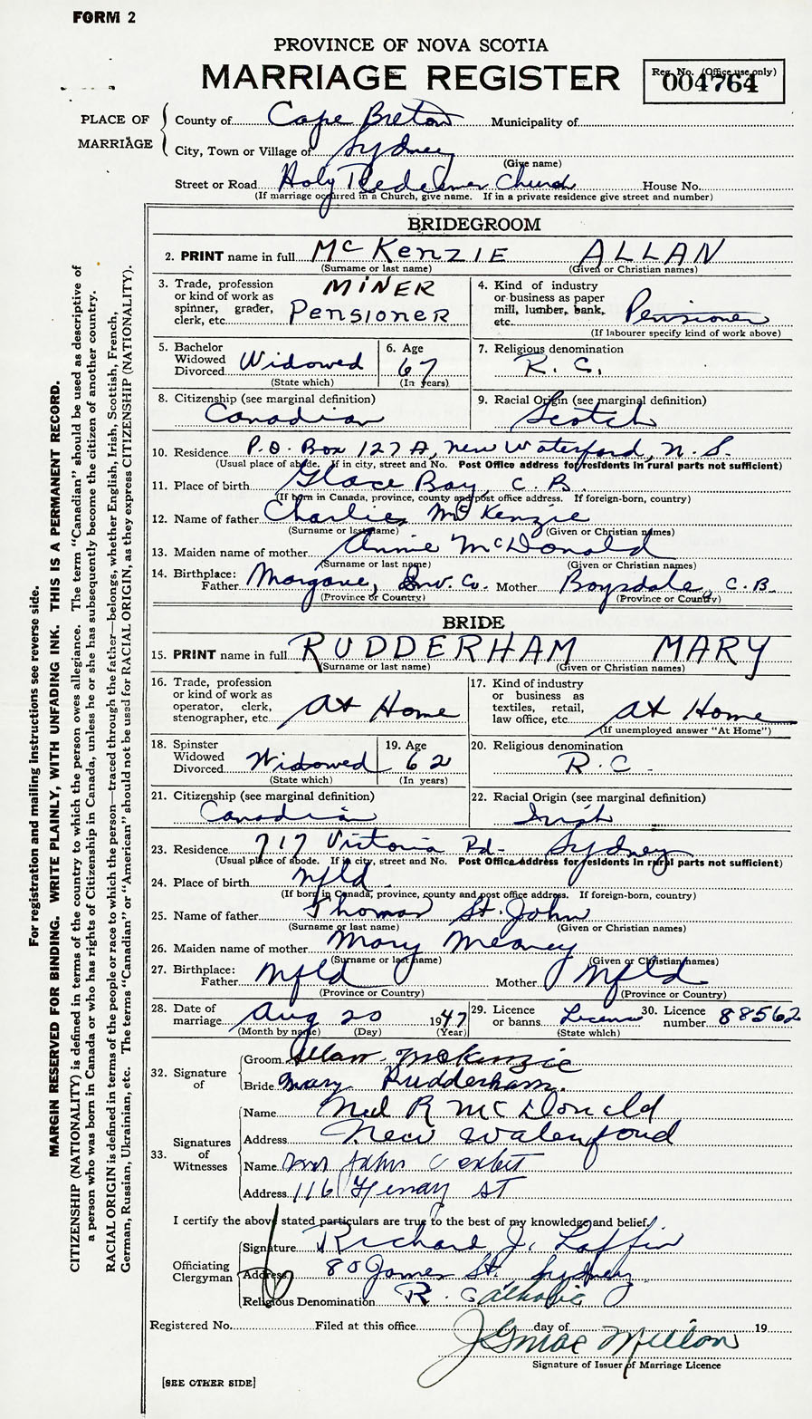 28. Date of marriage August 20 1947 29. By license or banns License 30. License number 88562