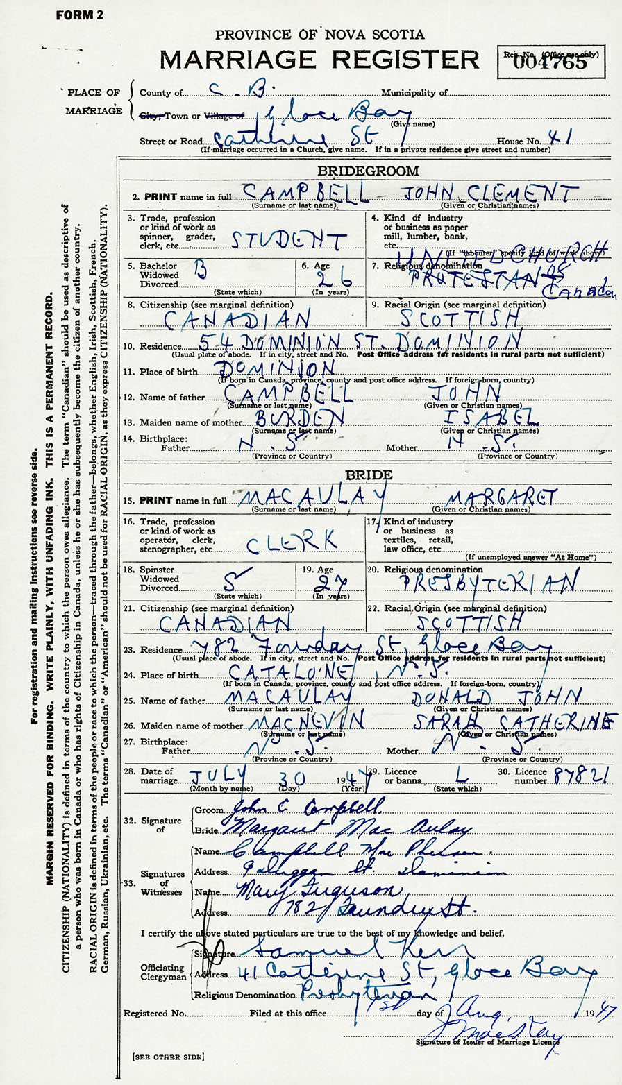 28. Date of marriage July 30 1947 29. By license or banns License 30. License number 87821
