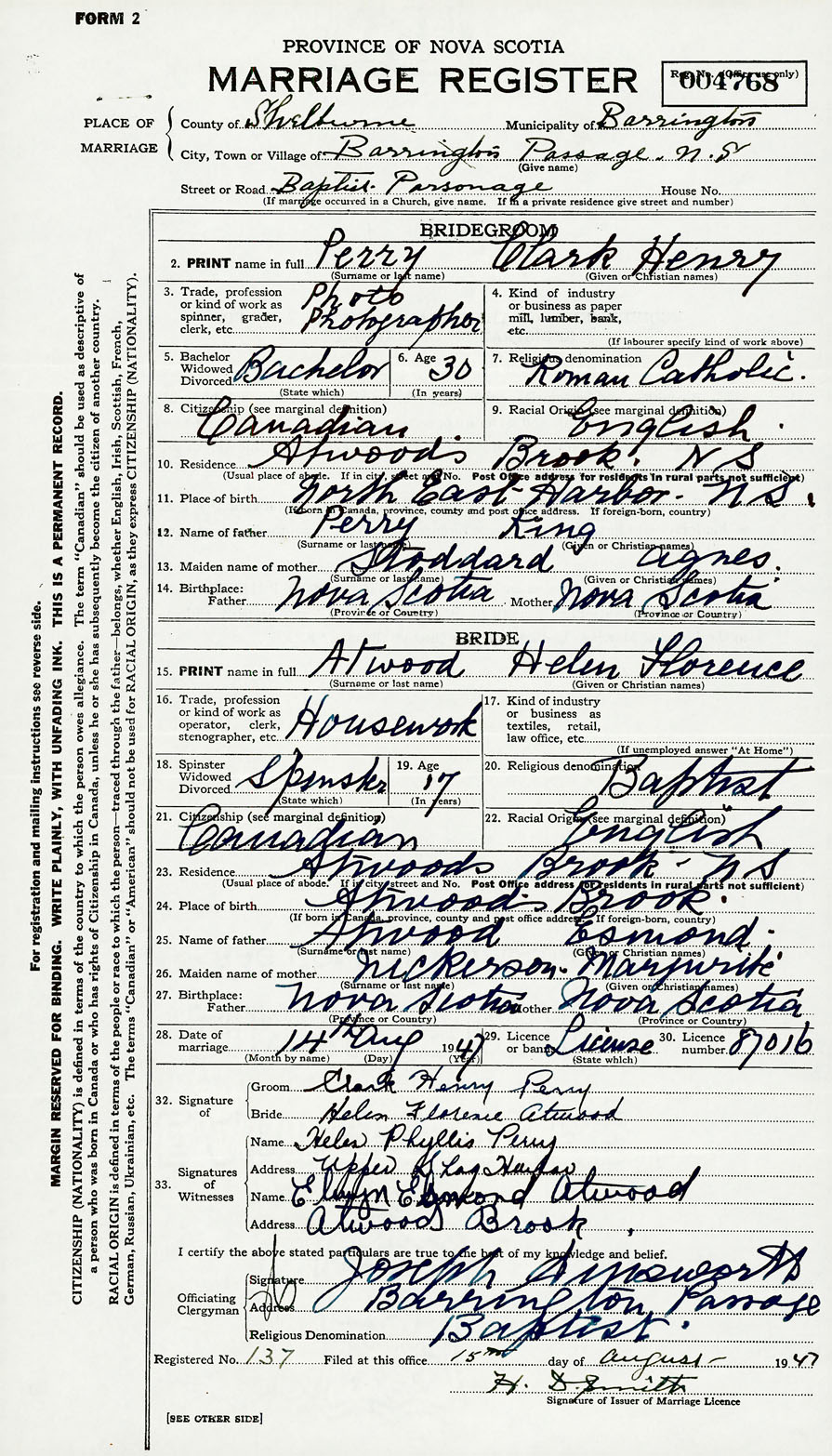 28. Date of marriage August 14 1947 29. By license or banns License 30. License number 87016