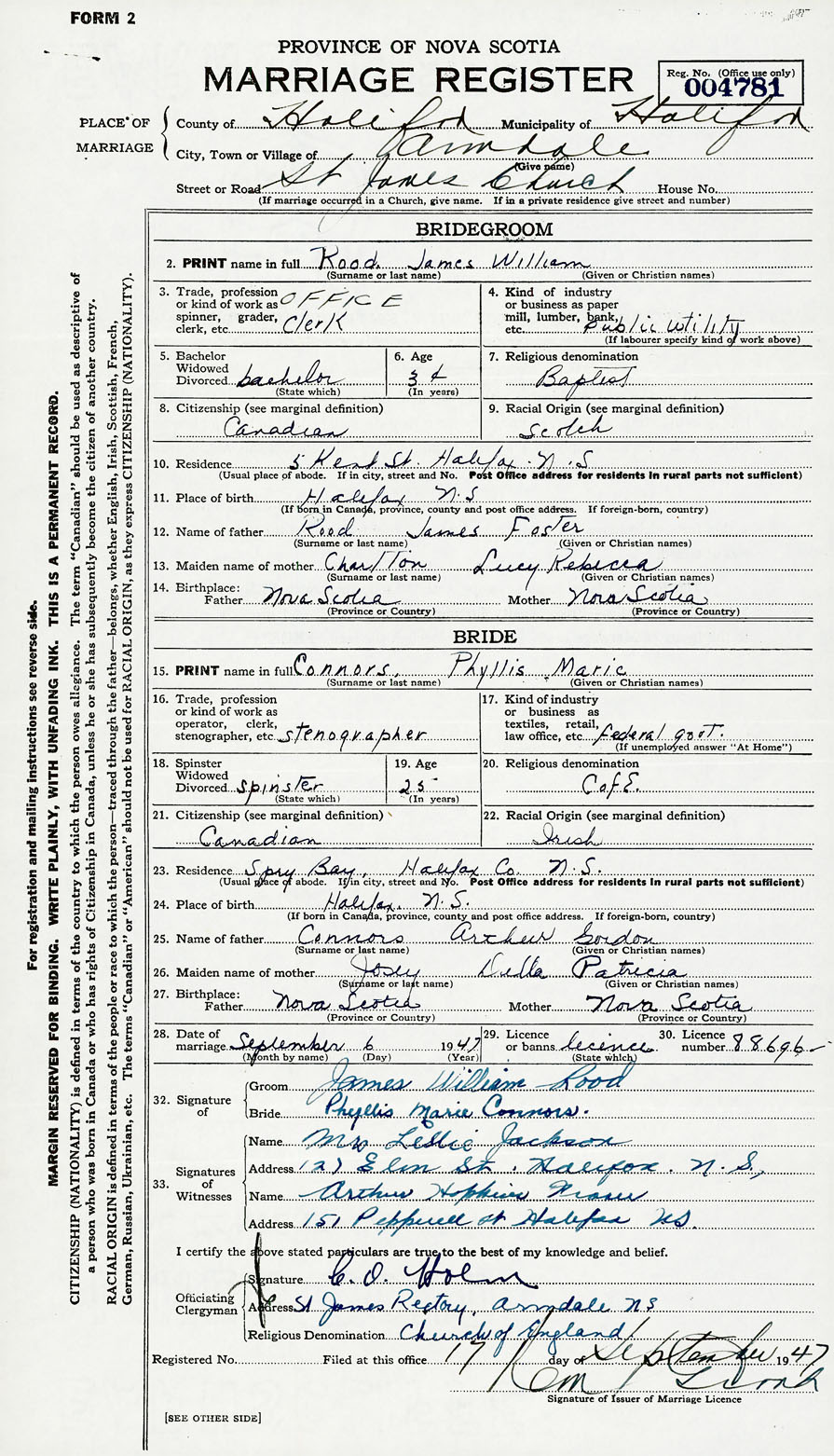 28. Date of marriage September 6 1947 29. By license or banns License 30. License number 88696