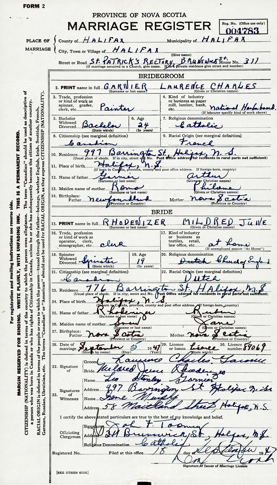 28. Date of marriage September 5 1947 29. By license or banns License 30. License number 89069