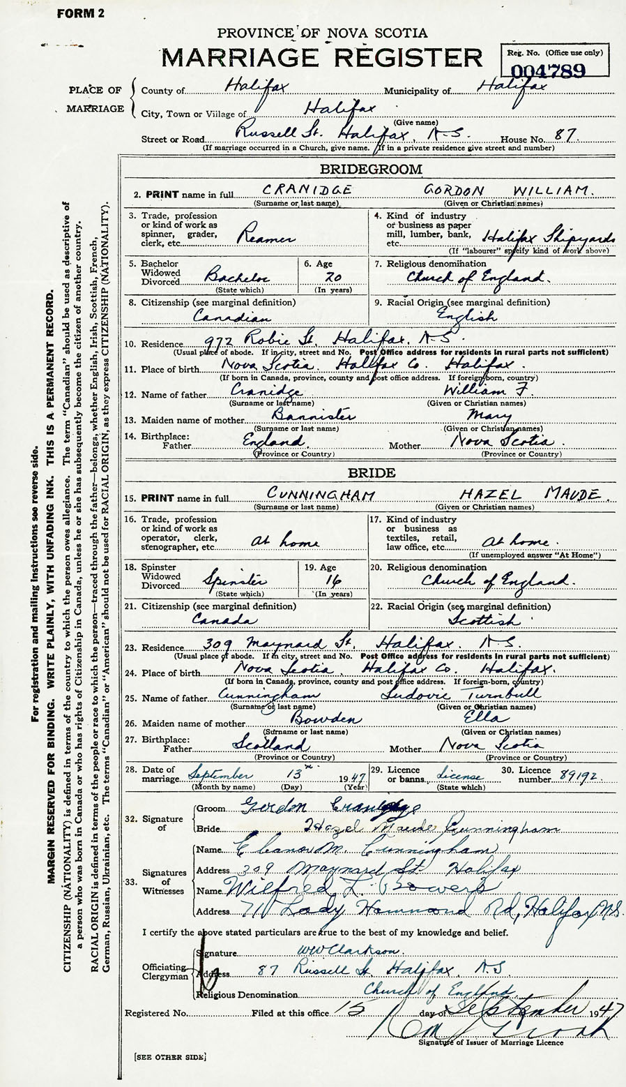 28. Date of marriage September 13 1947 29. By license or banns License 30. License number 89192