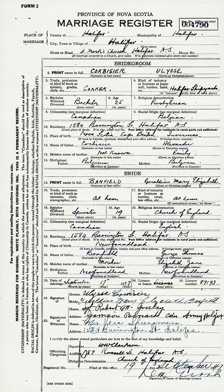 28. Date of marriage September 17 1947 29. By license or banns License 30. License number 89193