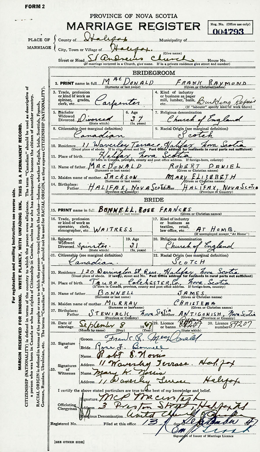 Groom Frank Raymond MacDonald