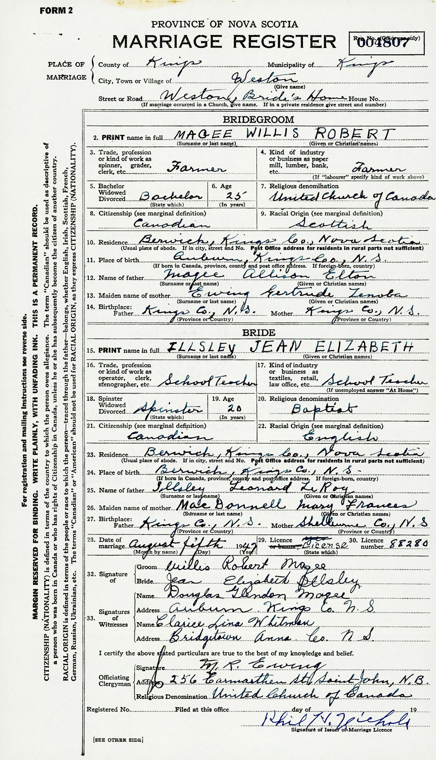 28. Date of marriage August 5 1947 29. By license or banns License 30. License number 88280