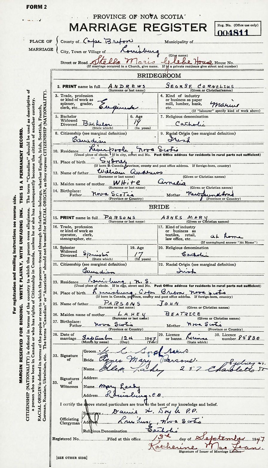 28. Date of marriage September 12 1947 29. By license or banns License 30. License number 85830
