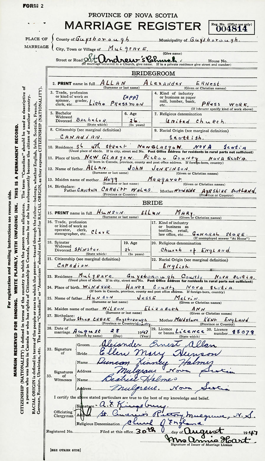 Groom Alexander Ernest Allan