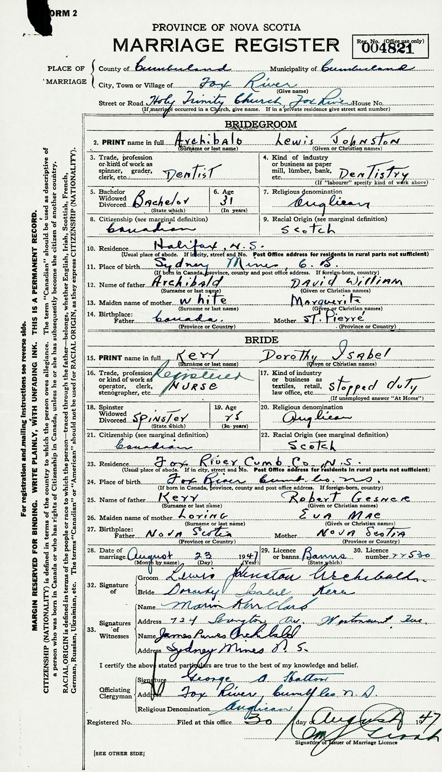 28. Date of marriage August 23 1947 29. By license or banns License 30. License number
