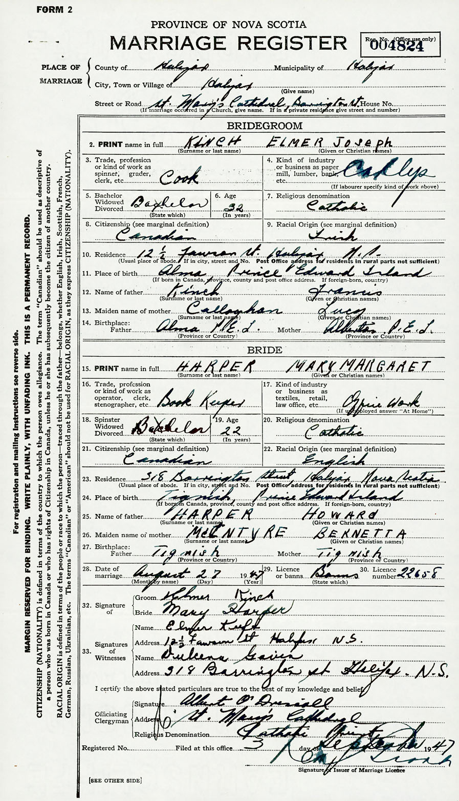 28. Date of marriage August 27 1947 29. By license or banns License 30. License number 22658