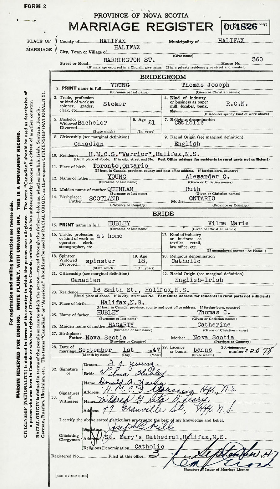 28. Date of marriage September 1 1947 29. By license or banns License 30. License number 22578