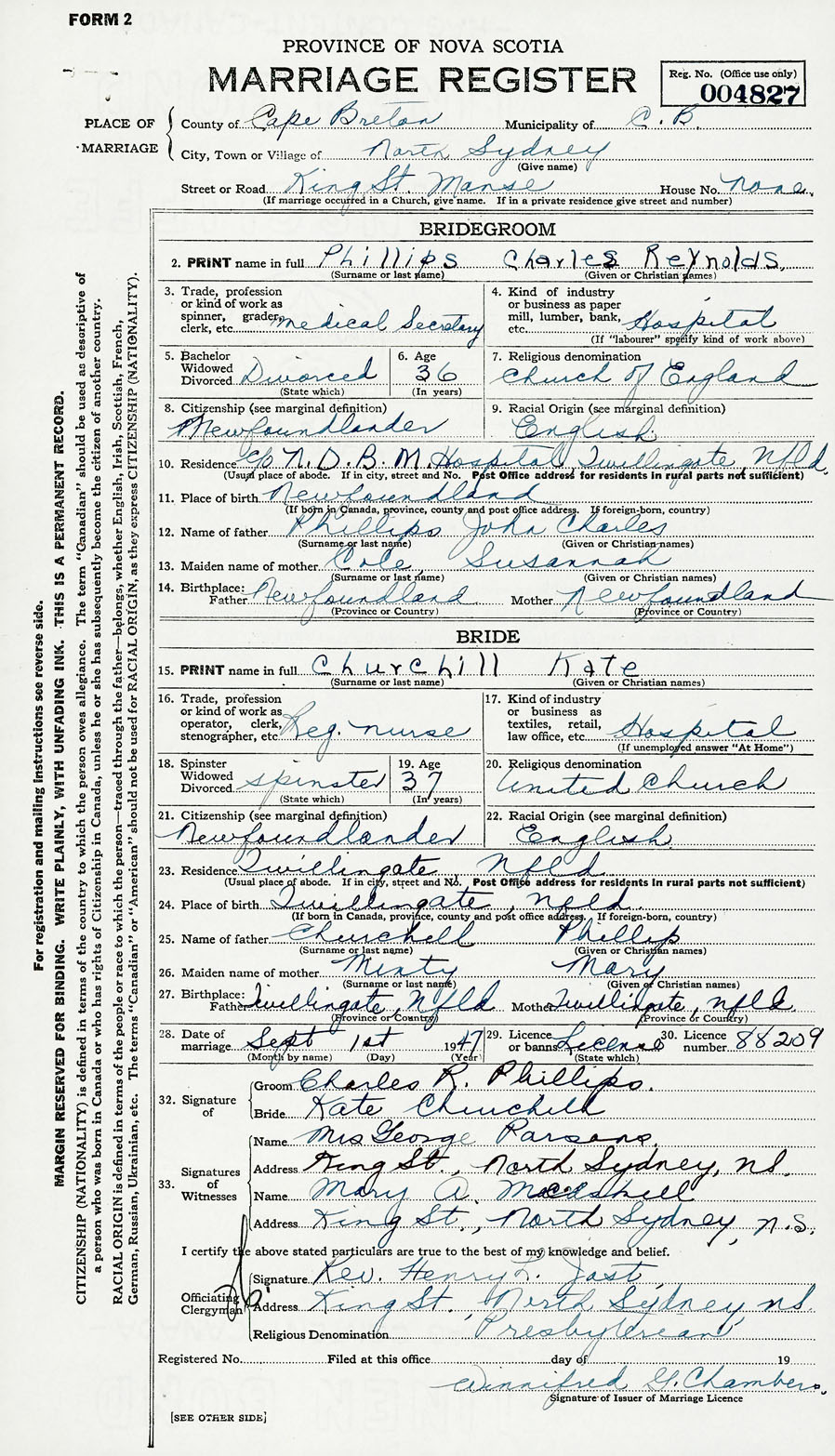 28. Date of marriage September 1 1947 29. By license or banns License 30. License number 88209