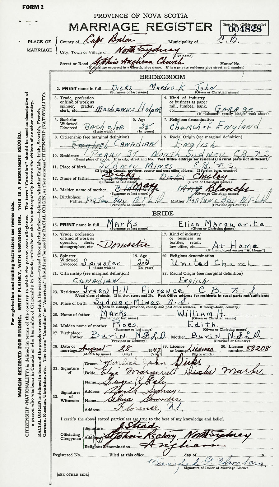28. Date of marriage August 28 1947 29. By license or banns License 30. License number