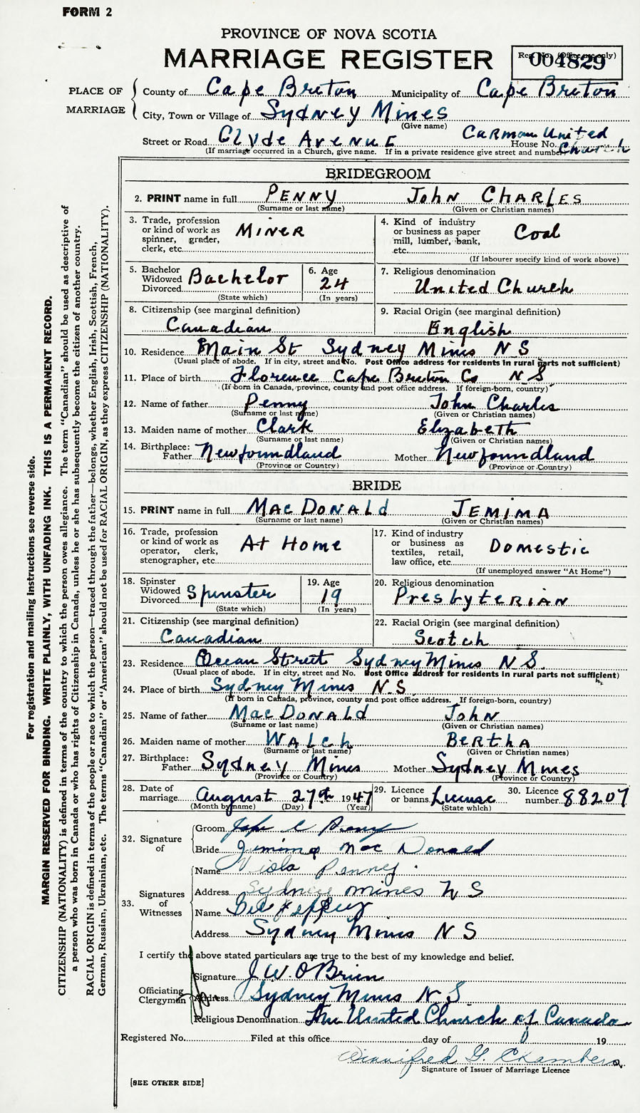 28. Date of marriage August 27 1947 29. By license or banns License 30. License number 88207