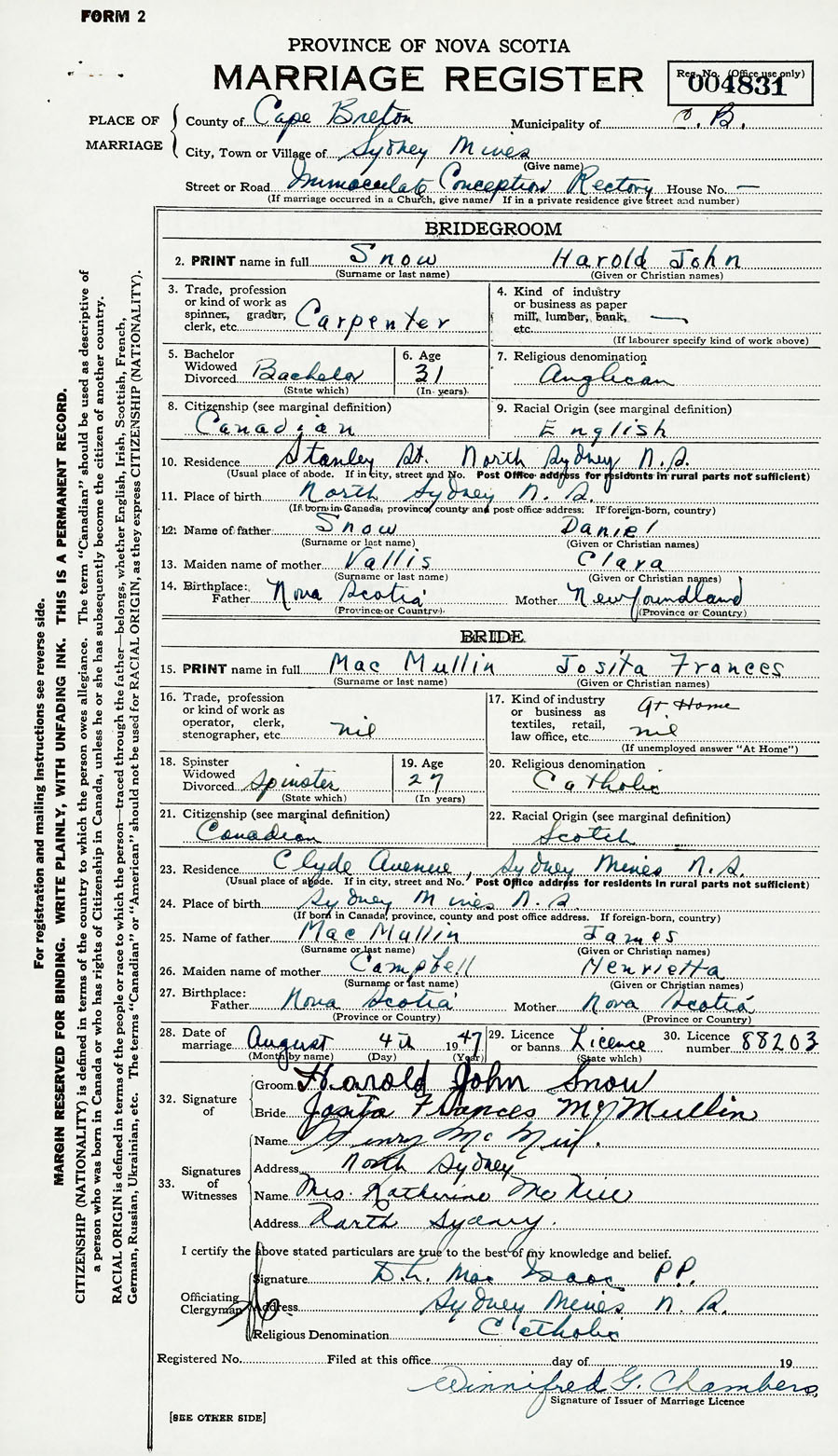 28. Date of marriage August 4 1947 29. By license or banns License 30. License number 88203