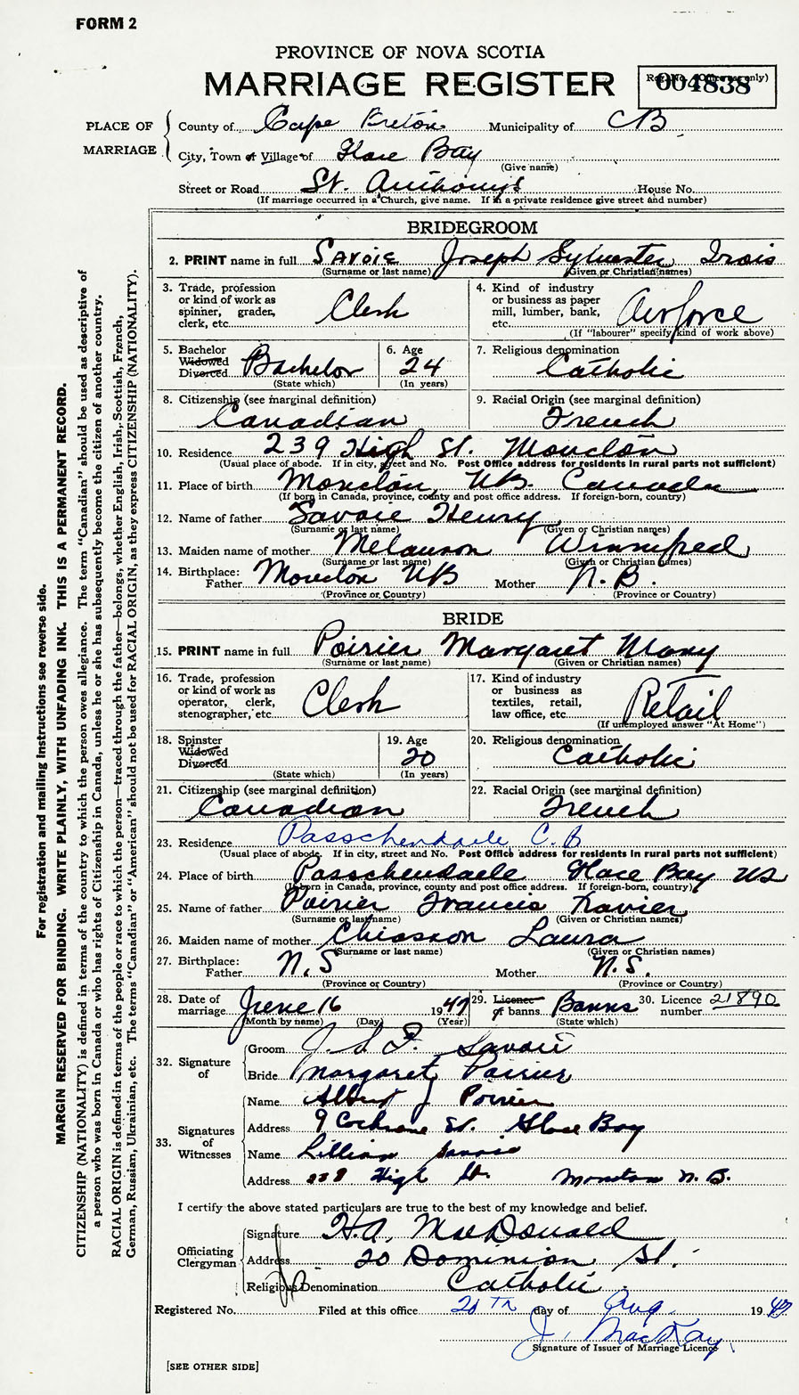 28. Date of marriage June 16 1947 29. By license or banns License 30. License number
