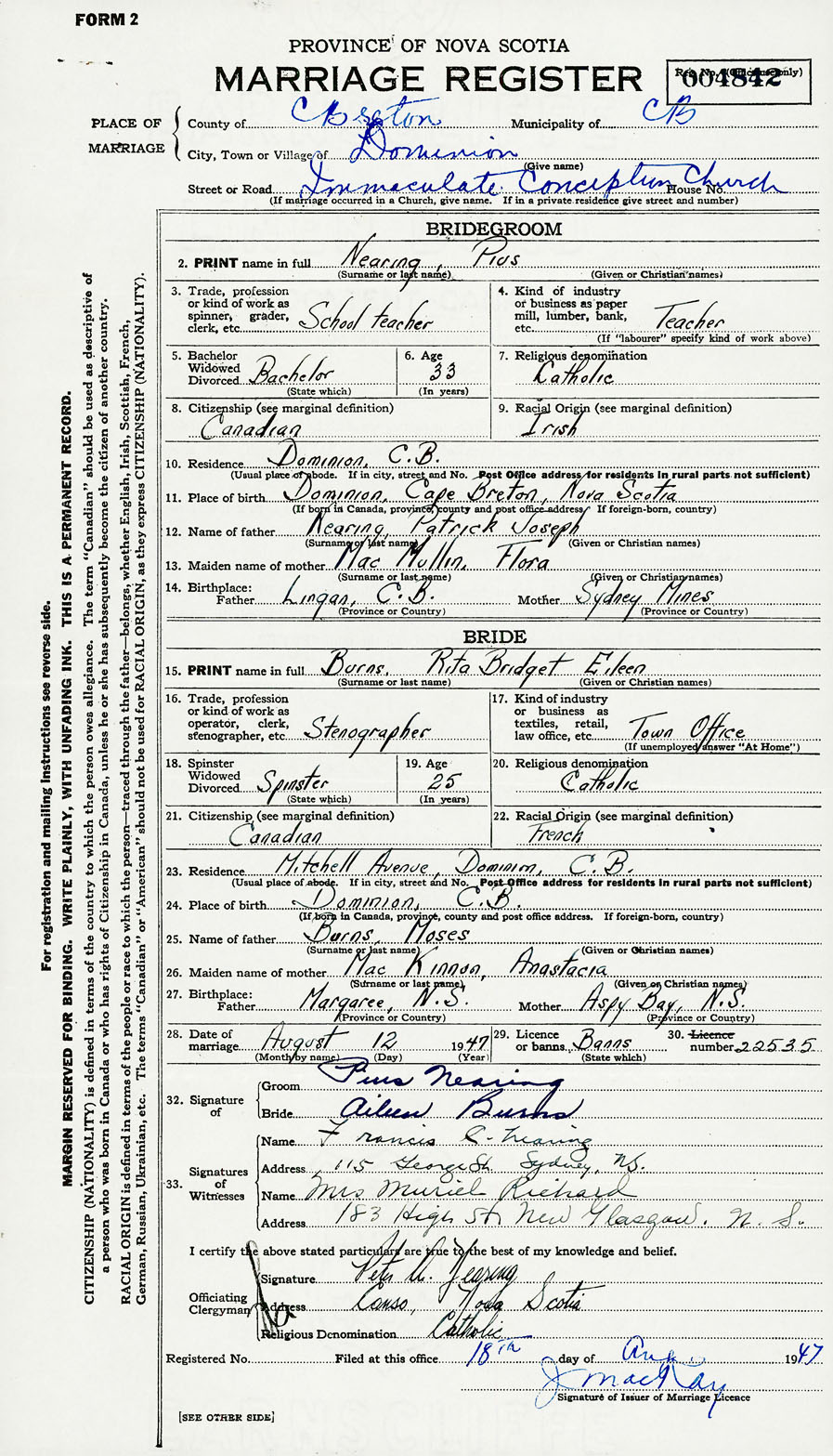 28. Date of marriage August 12 1947 29. By license or banns License 30. License number