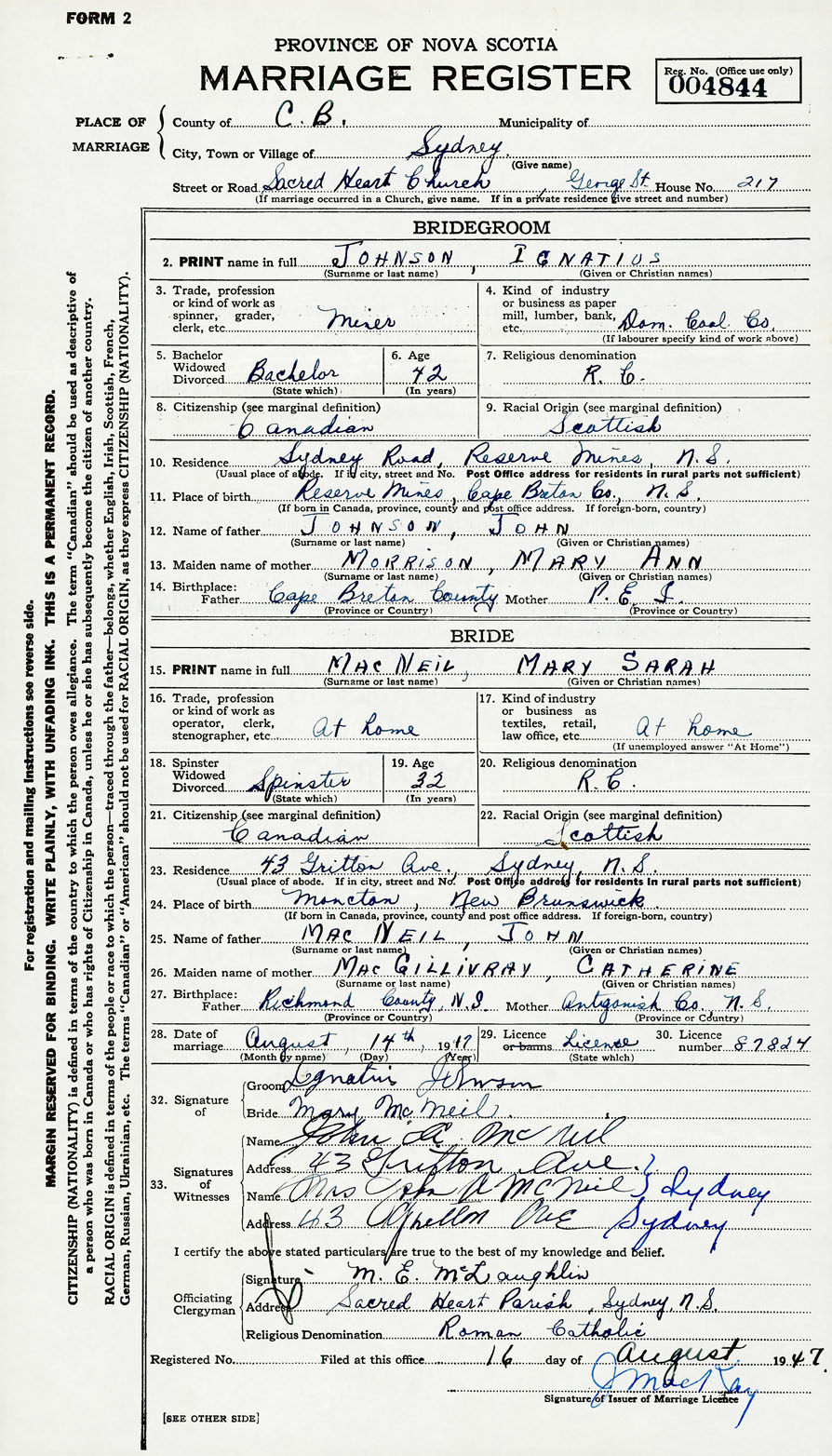 28. Date of marriage August 14 1947 29. By license or banns License 30. License number 87824