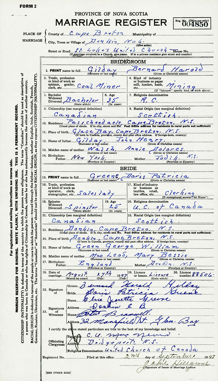 28. Date of marriage August 27 1947 29. By license or banns License 30. License number 88506