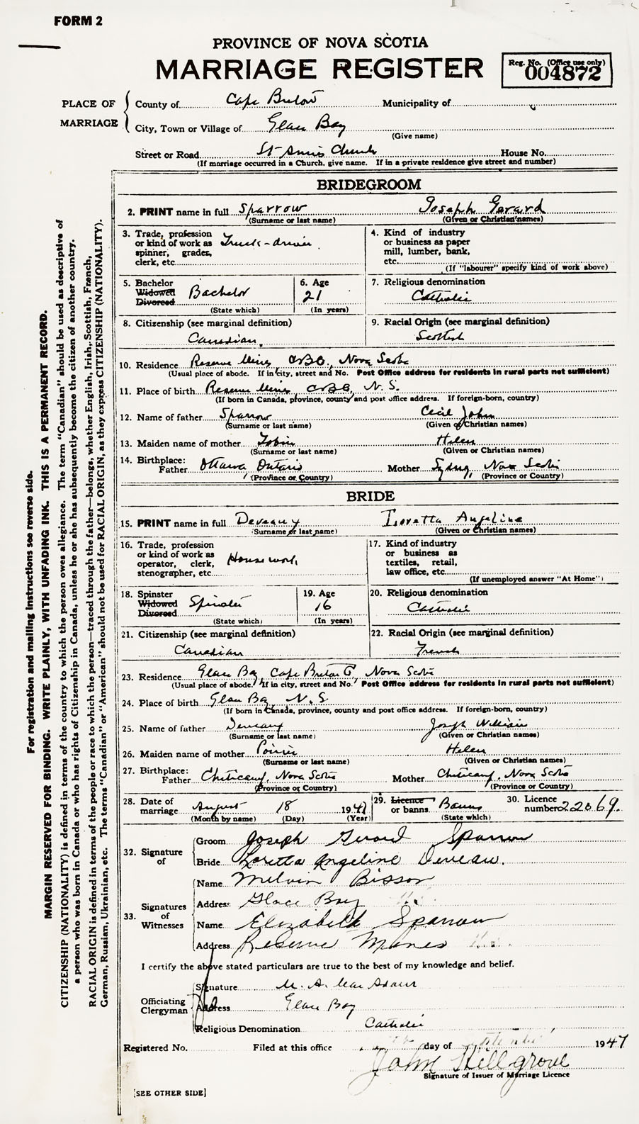 28. Date of marriage August 18 1947 29. By license or banns License 30. License number
