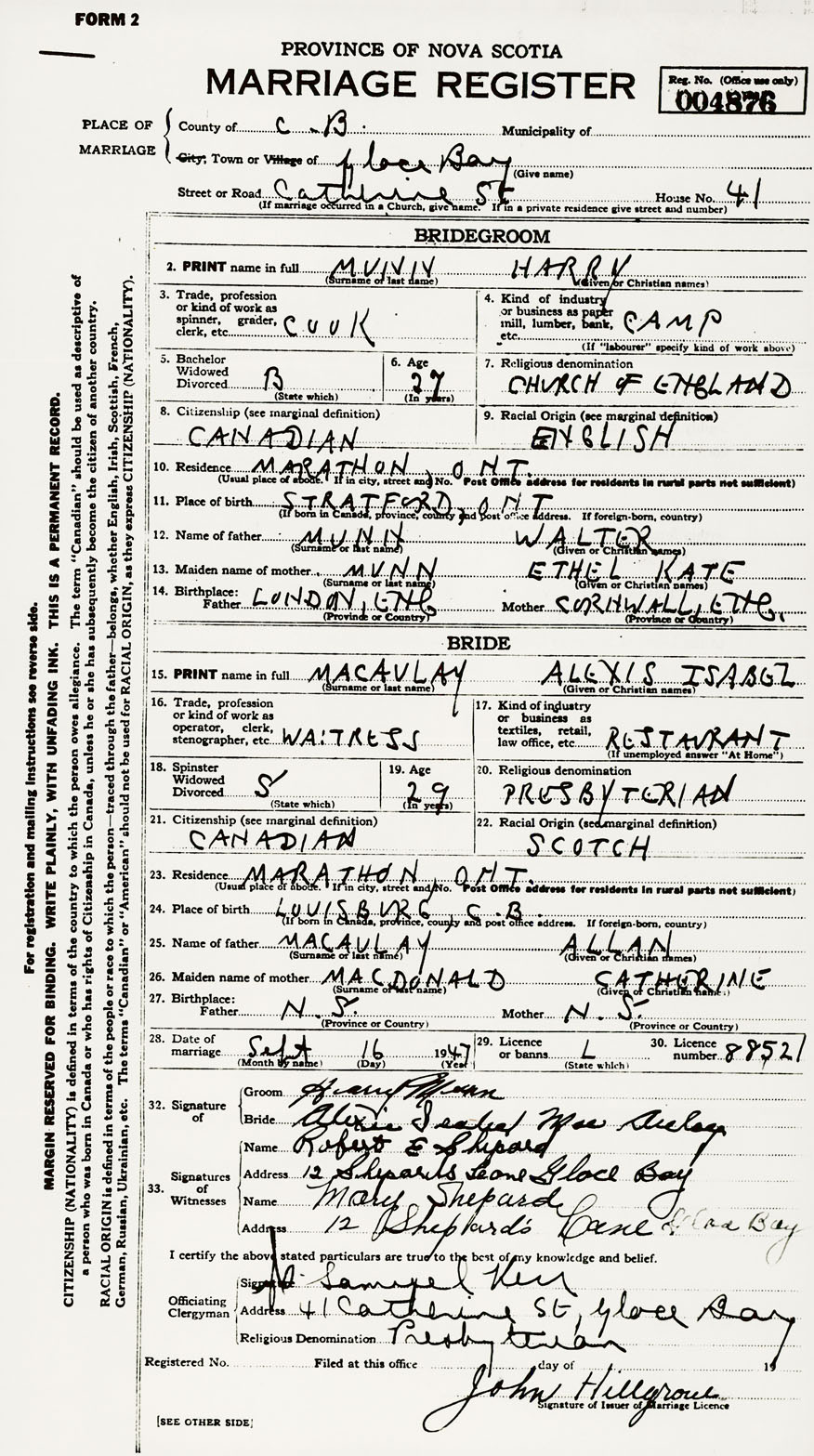 28. Date of marriage September 16 1947 29. By license or banns License 30. License number 88521