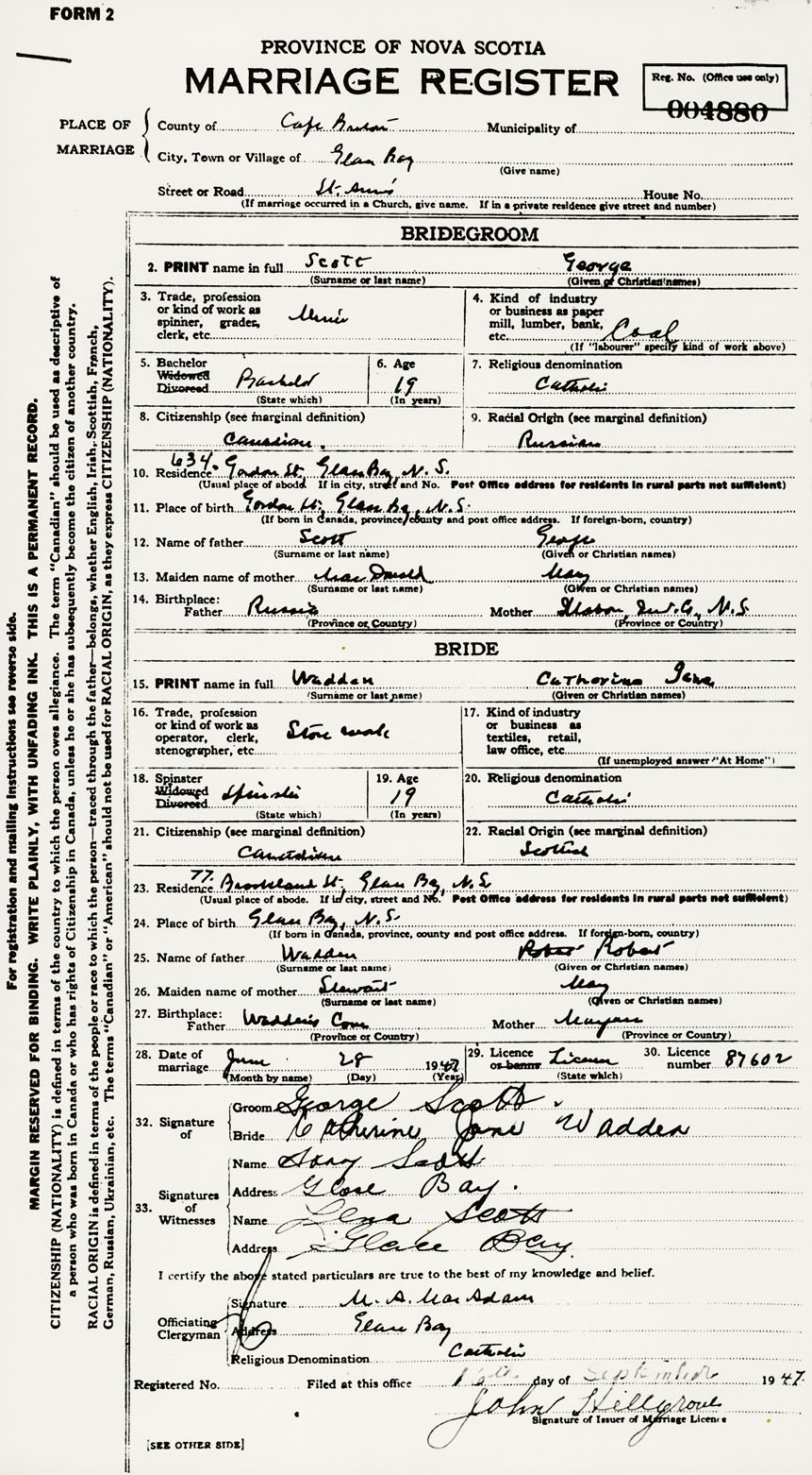 28. Date of marriage June 28 1947 29. By license or banns License 30. License number 87602