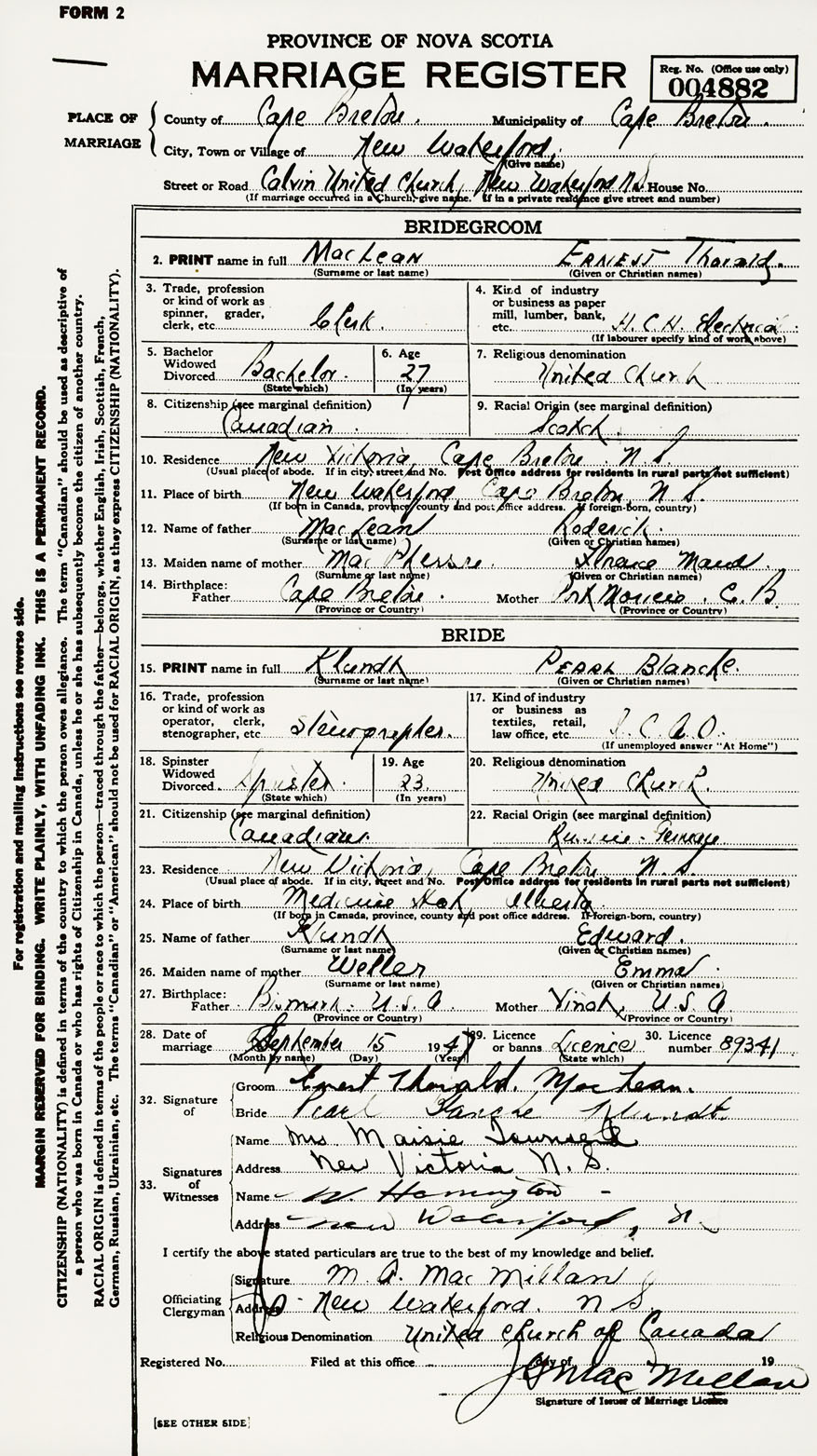 Groom Ernest Thorald MacLean