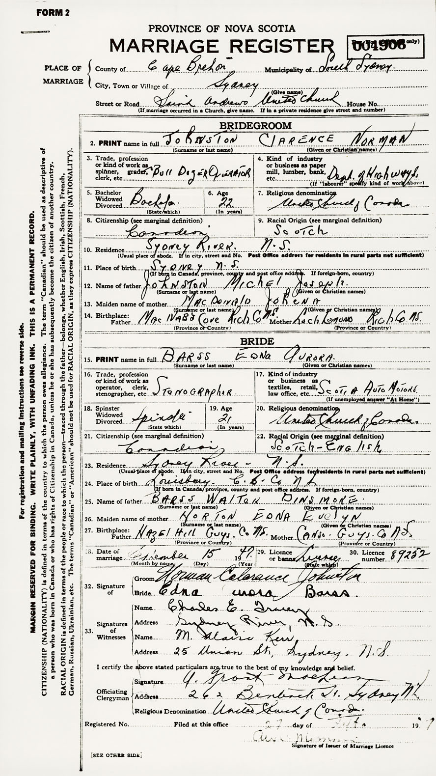 11. Place of birth Sydney, Cape Breton County, Nova Scotia