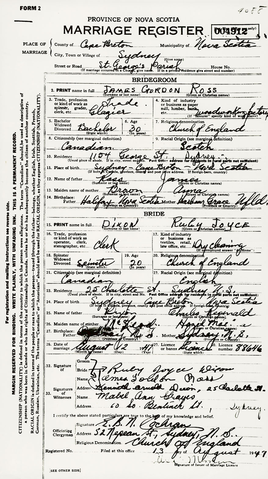 27. Birthplace Father Sydney, Nova Scotia Mother Sydney, Nova Scotia