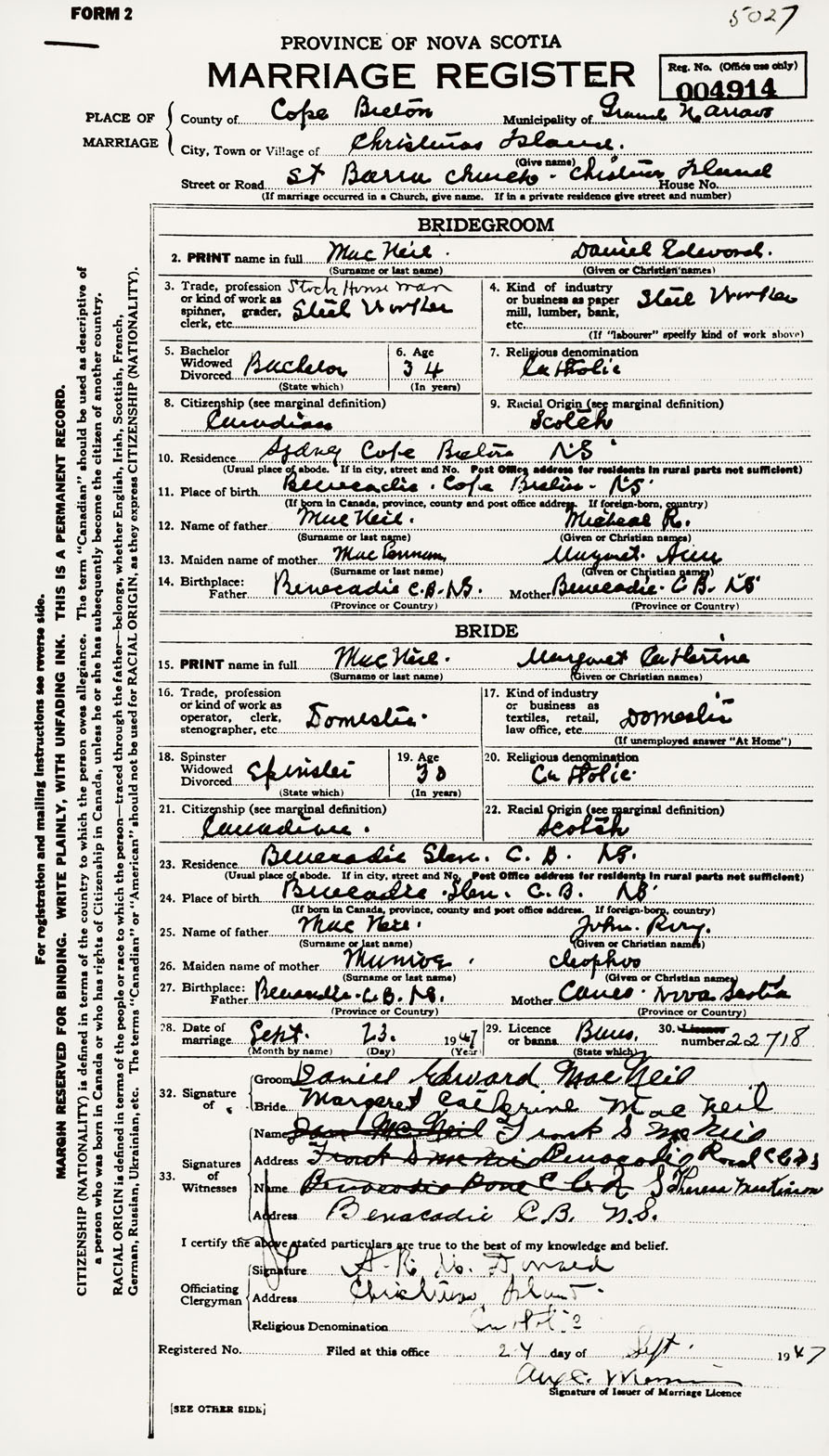 28. Date of marriage September 23 1947 29. By license or banns License 30. License number 22718