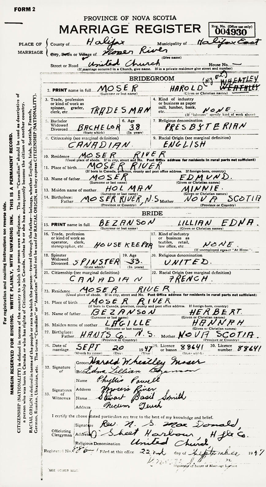 28. Date of marriage September 20 1947 29. By license or banns License 30. License number 88641
