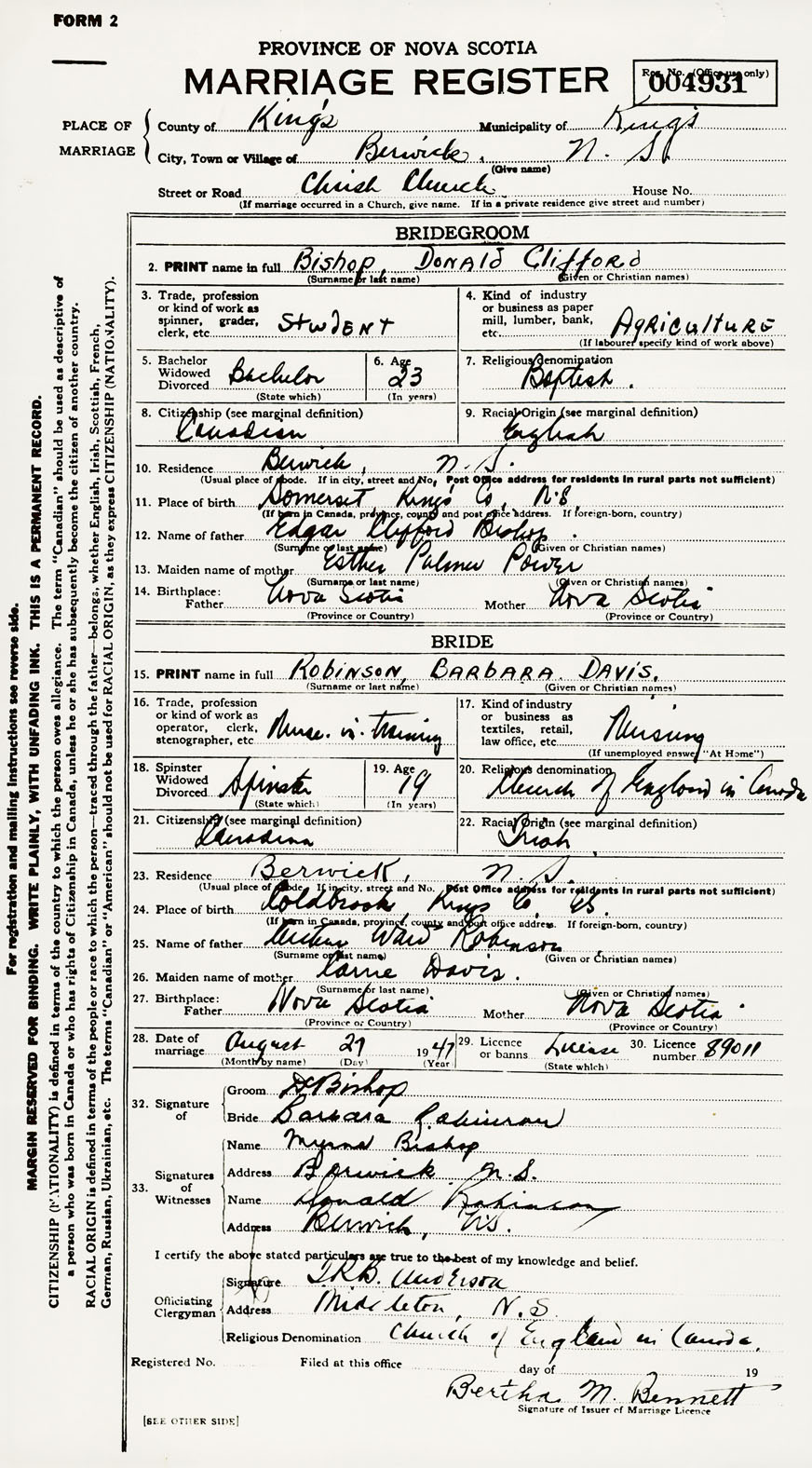 28. Date of marriage August 27 1947 29. By license or banns License 30. License number 89011
