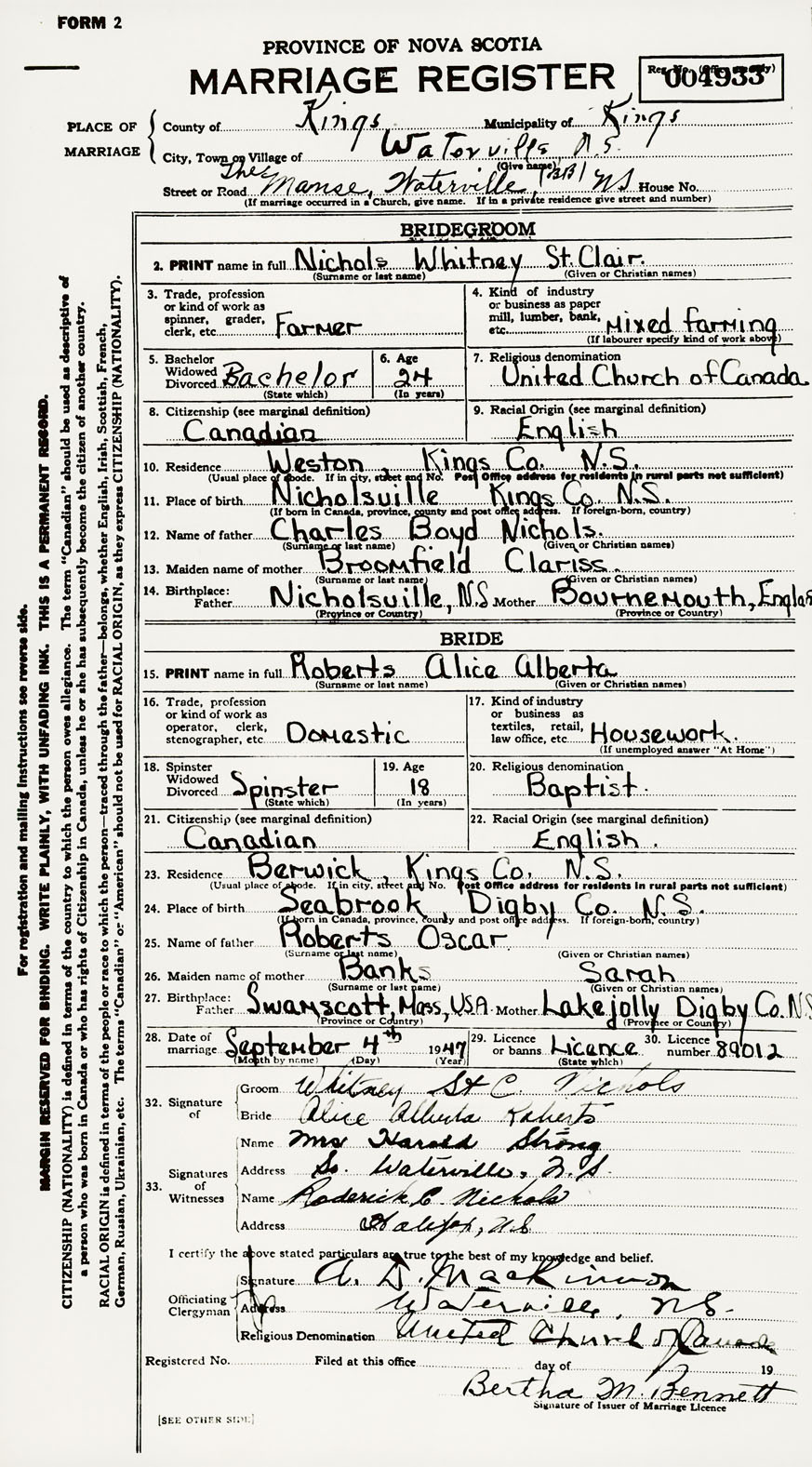 11. Place of birth Nicholsville, Kings County, Nova Scotia