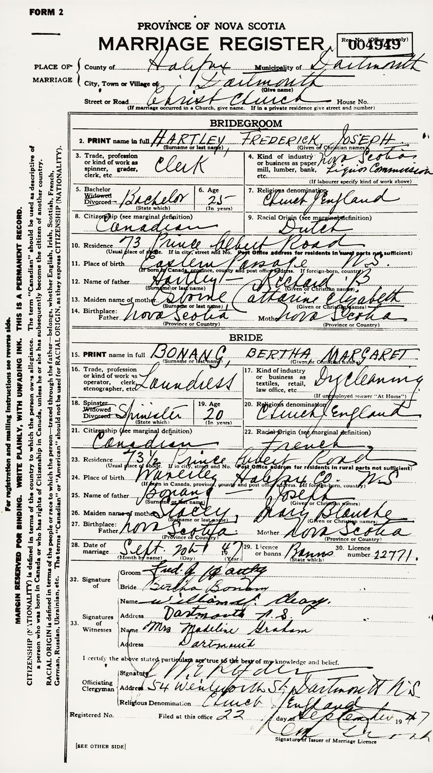 28. Date of marriage September 20 1947 29. By license or banns License 30. License number