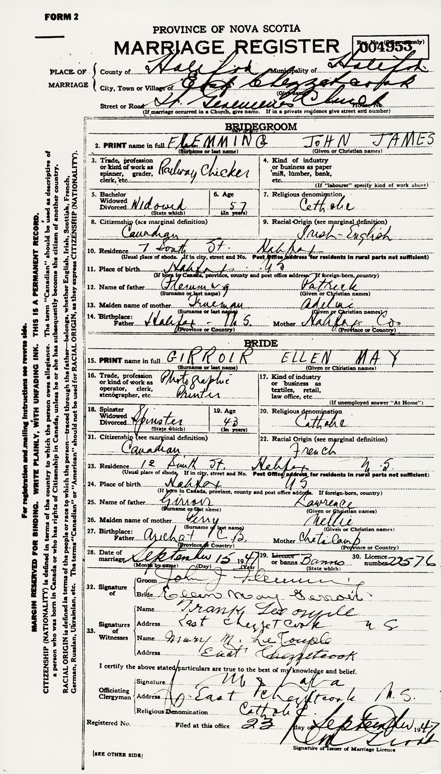 28. Date of marriage September 15 1947 29. By license or banns License 30. License number 22576