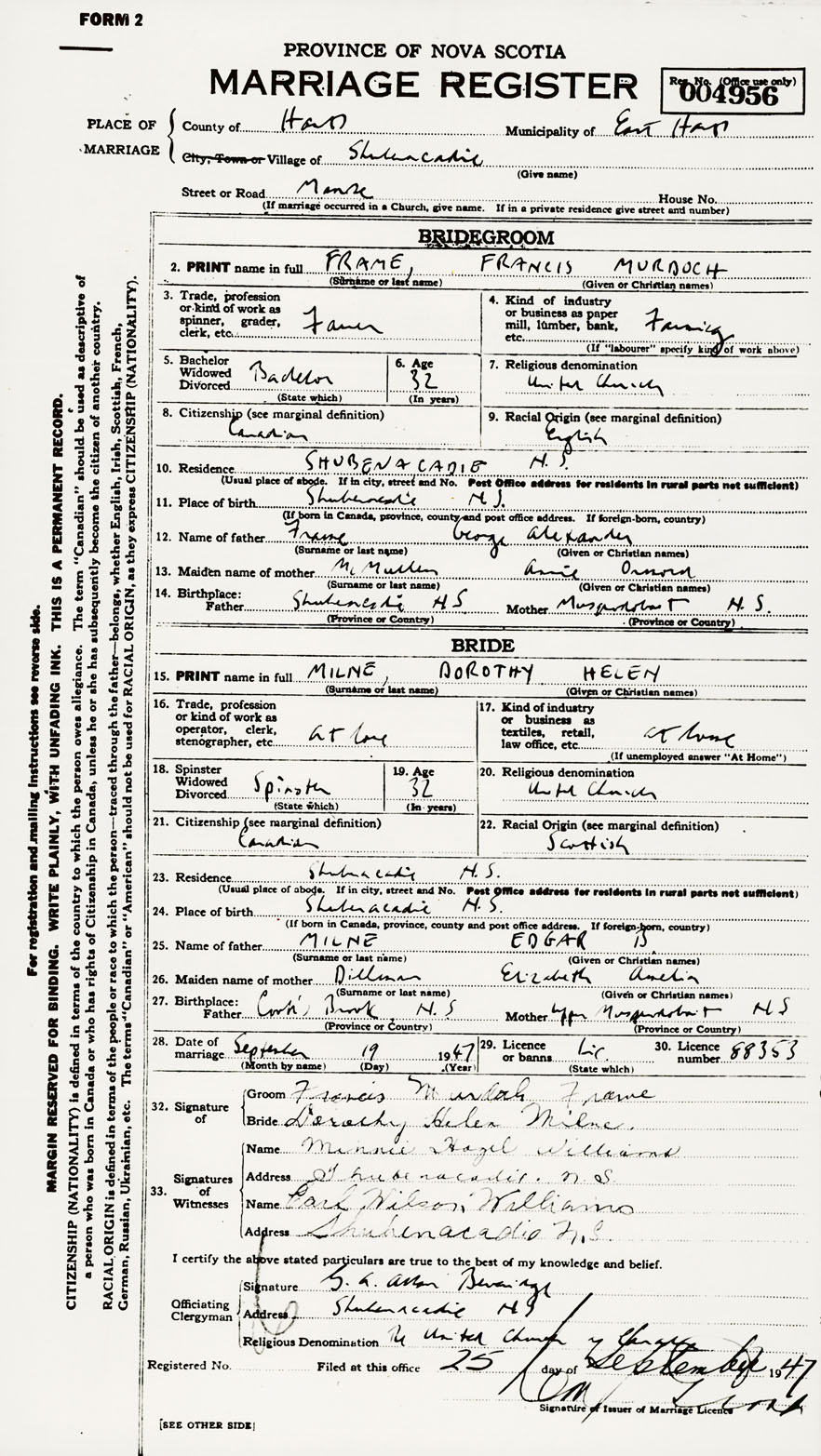 28. Date of marriage September 19 1947 29. By license or banns License 30. License number 88353