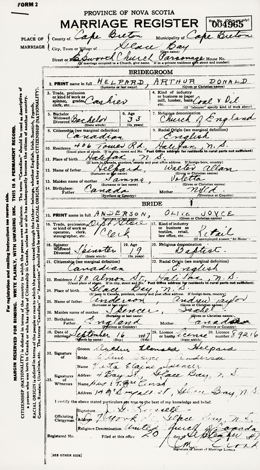28. Date of marriage September 16 1947 29. By license or banns License 30. License number 89216