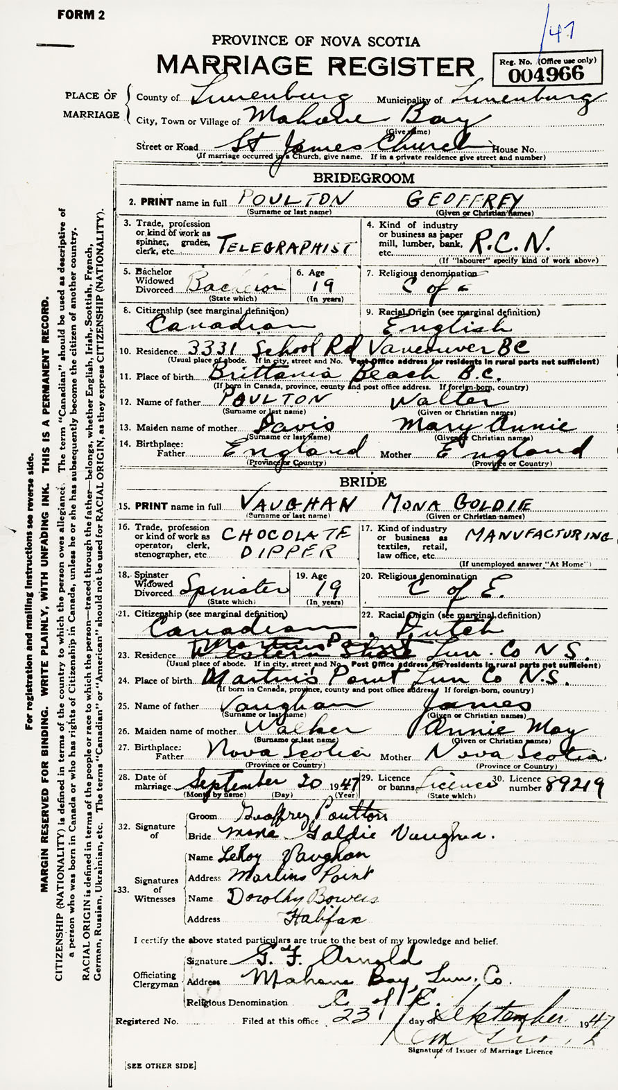 28. Date of marriage September 20 1947 29. By license or banns License 30. License number 89219