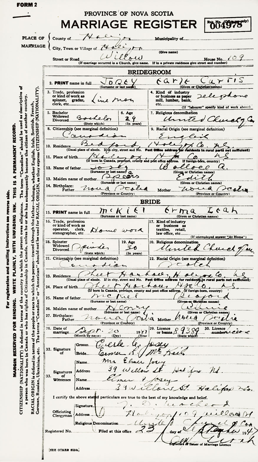 28. Date of marriage September 20 1947 29. By license or banns License 30. License number 89389