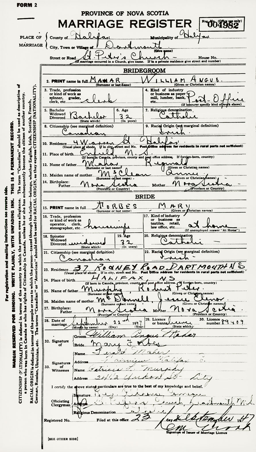 28. Date of marriage September 22 1947 29. By license or banns License 30. License number 89409