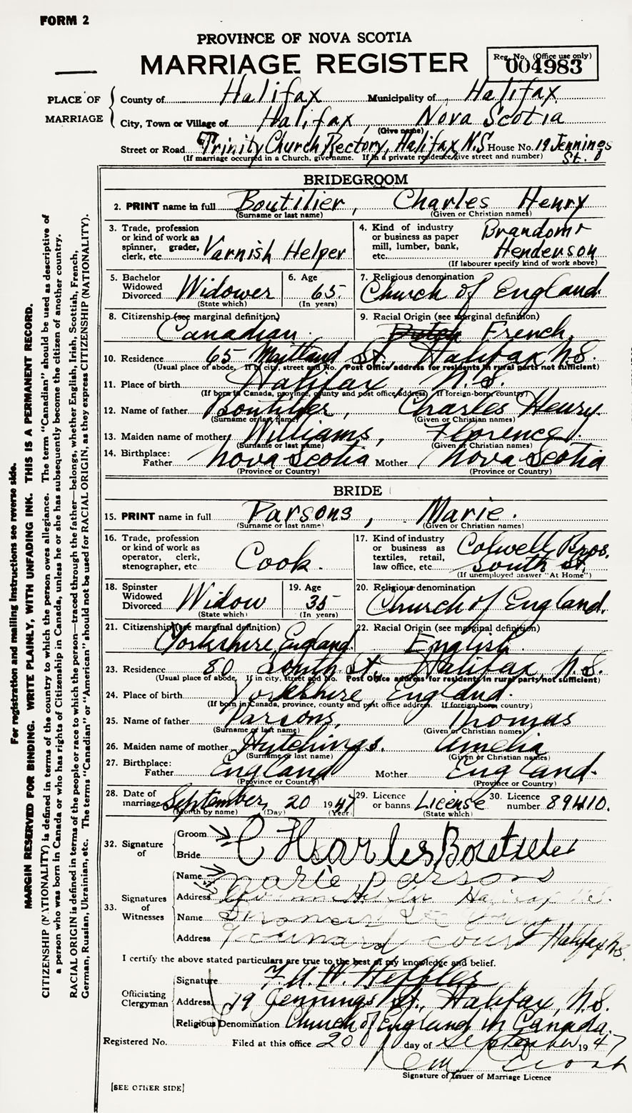 28. Date of marriage September 20 1947 29. By license or banns License 30. License number 89410