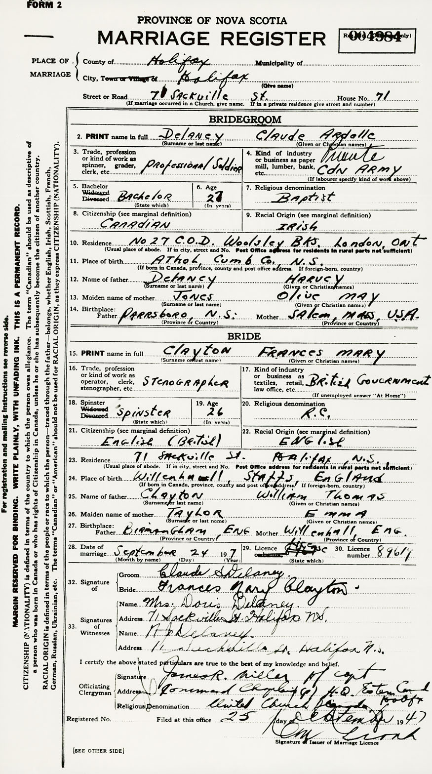 28. Date of marriage September 24 1947 29. By license or banns License 30. License number 89619