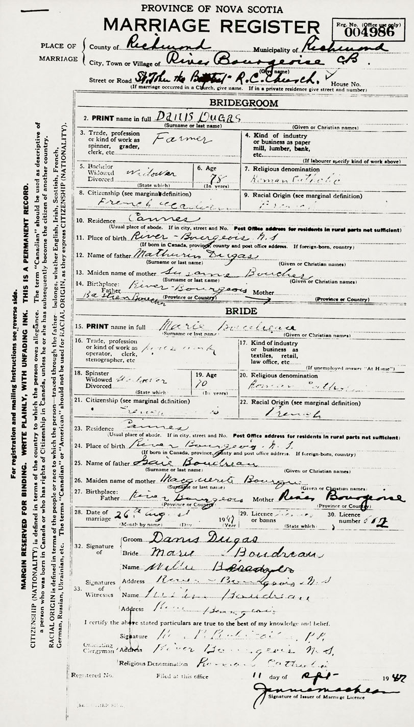 28. Date of marriage August 26 1947 29. By license or banns License 30. License number 502