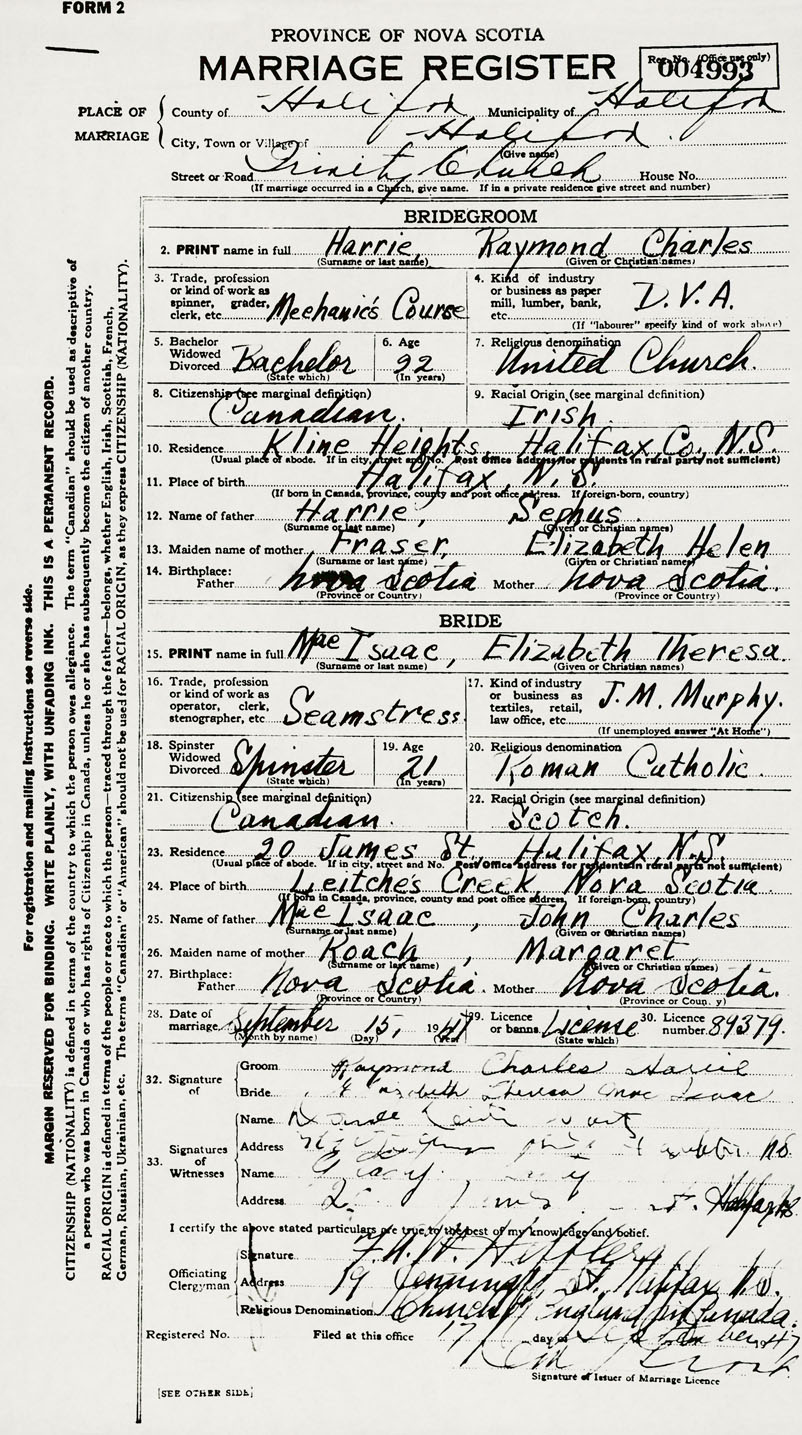 28. Date of marriage September 15 1947 29. By license or banns License 30. License number 89379