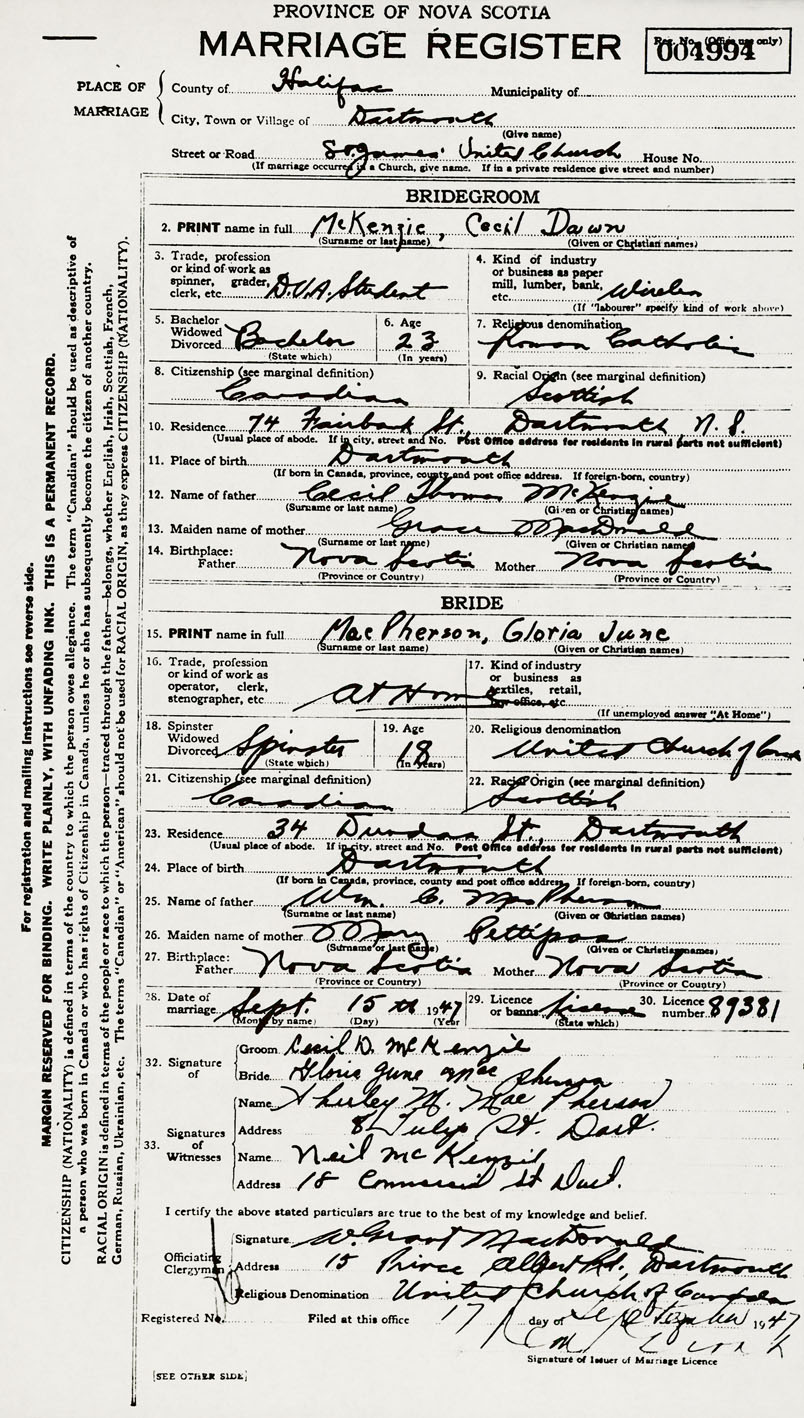 12. Name of father Cecil Thomas McKenzie