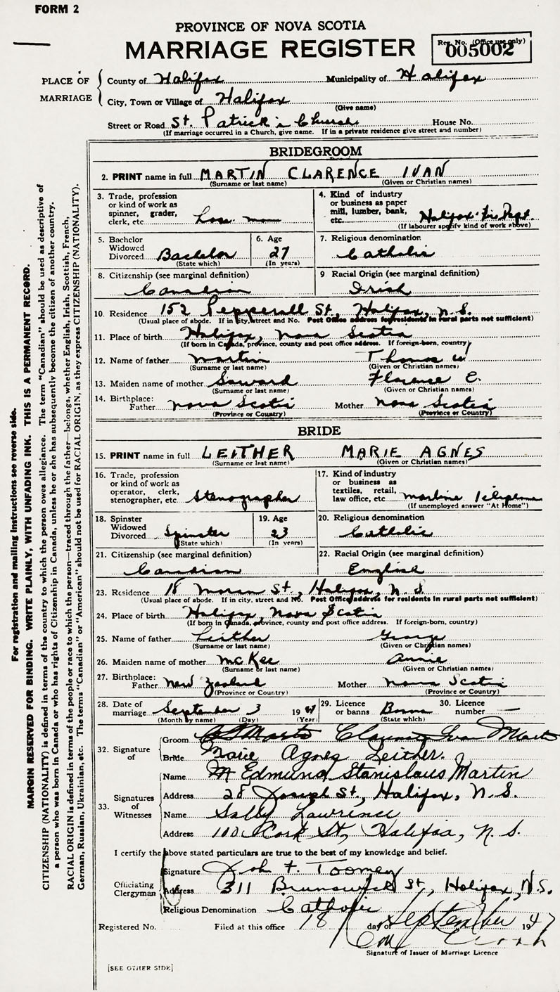 28. Date of marriage September 3 1947 29. By license or banns License 30. License number