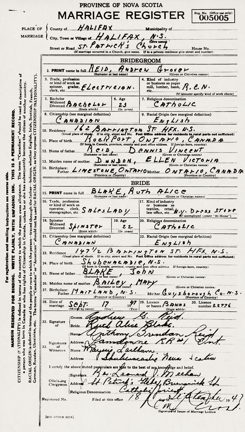 28. Date of marriage September 17 1947 29. By license or banns Banns 30. License number Banns