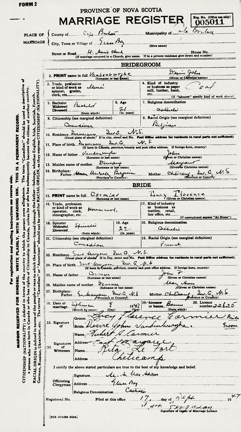 14. Birthplace Father Merbek, Belgium Mother Cheticamp, Inv.Co., Nova Scotia