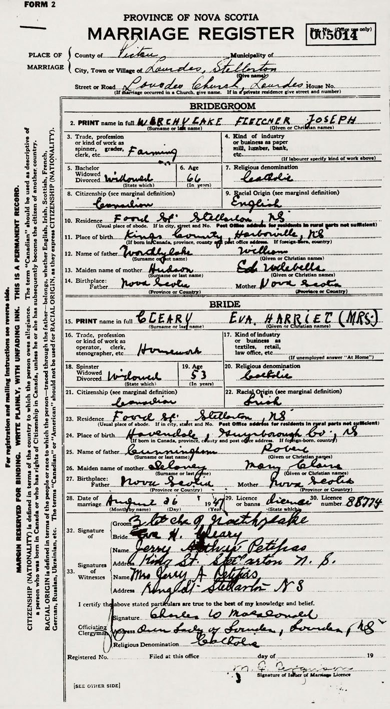 28. Date of marriage August 26 1947 29. By license or banns License 30. License number 88774