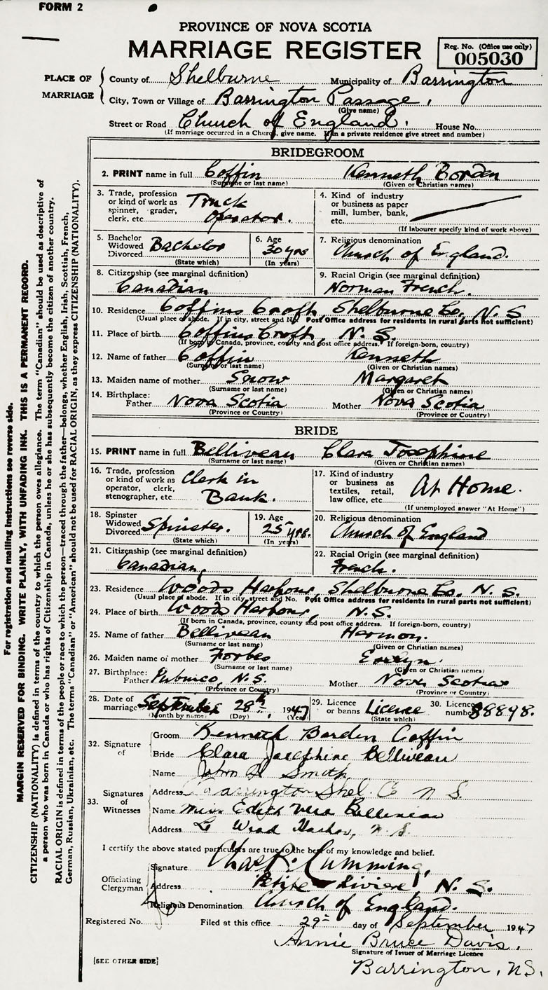11. Place of birth Coffinscroft, Nova Scotia