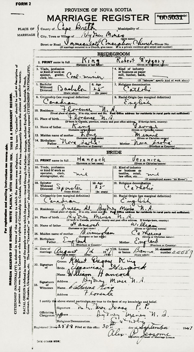 28. Date of marriage August 7 1947 29. By license or banns License 30. License number 22589